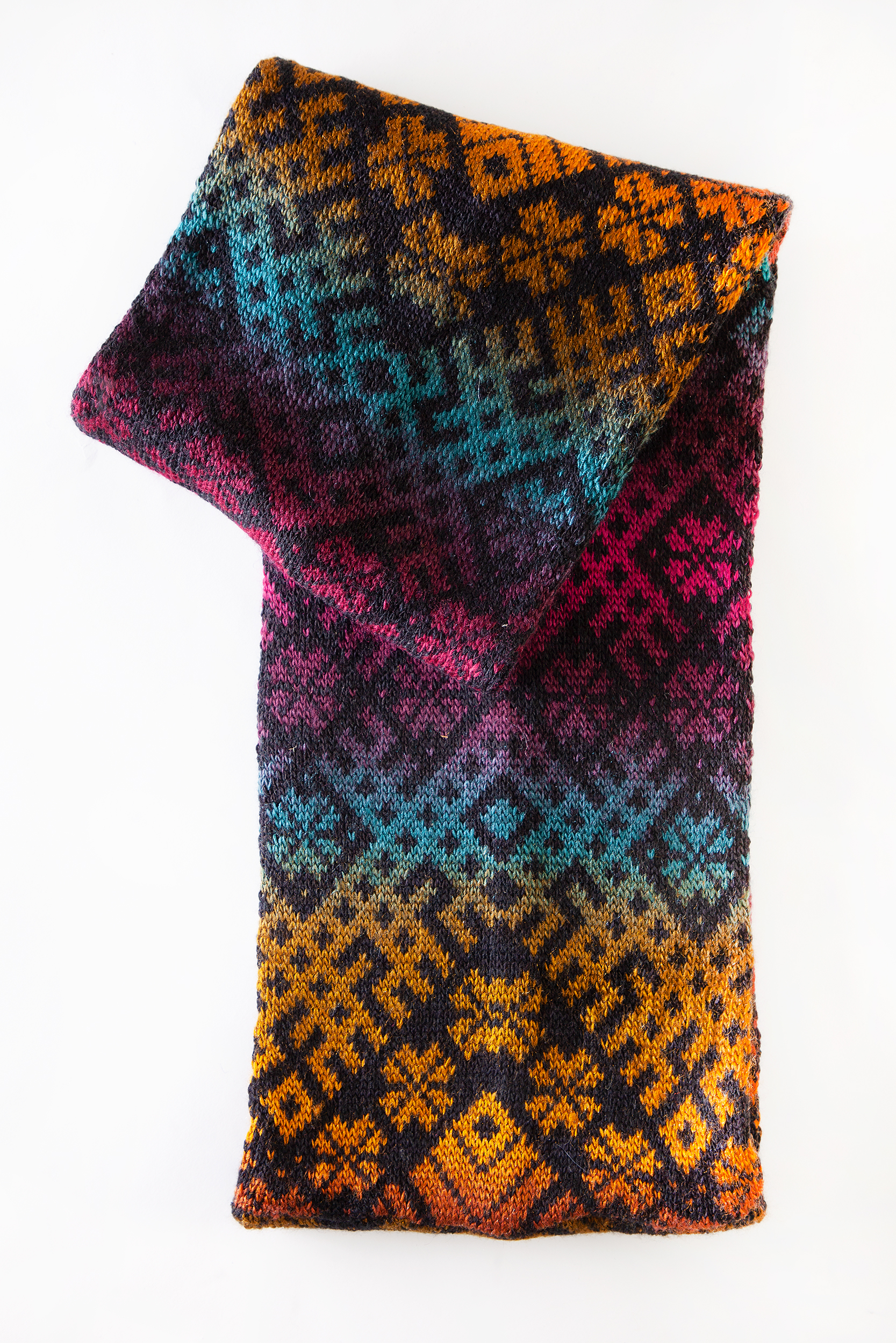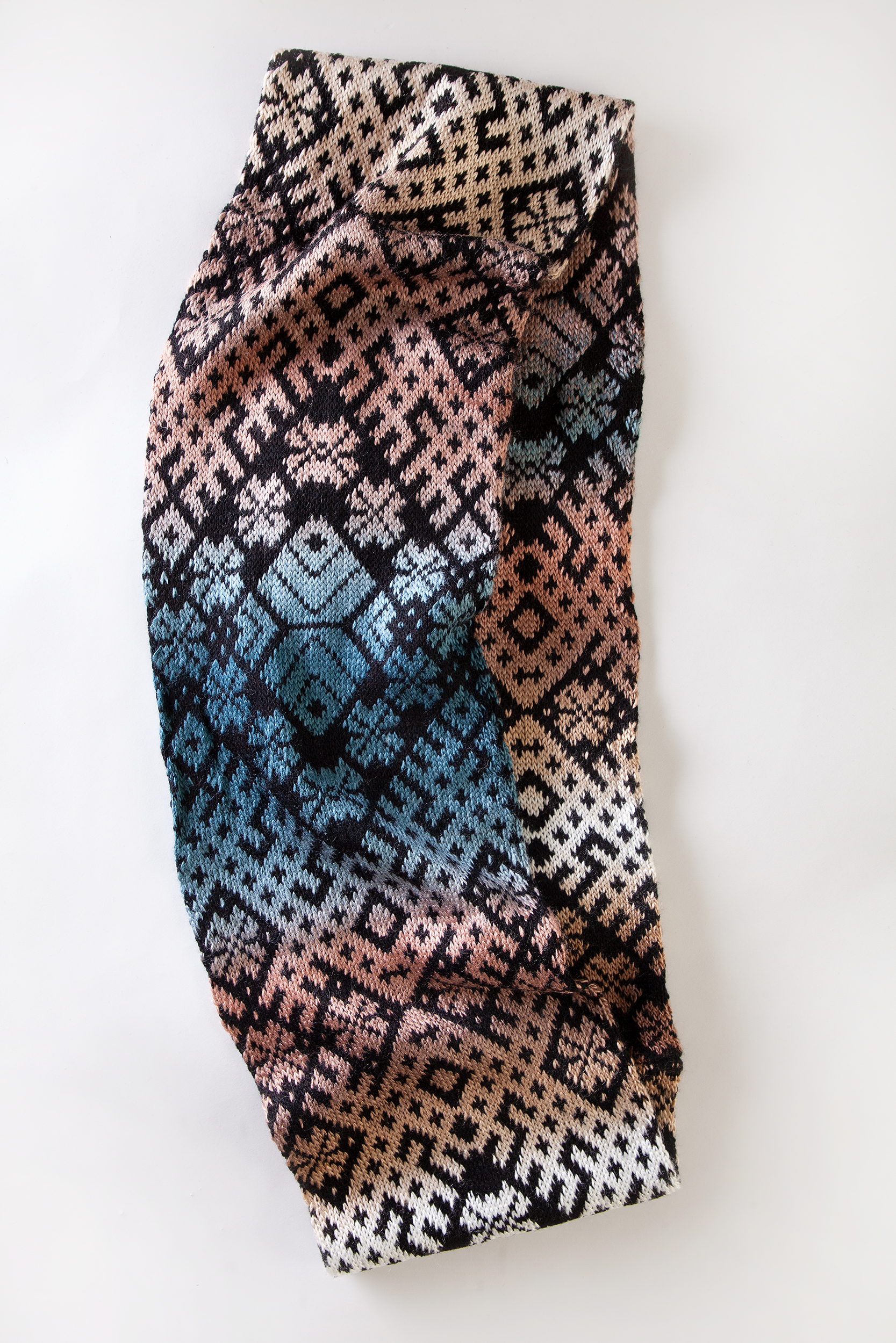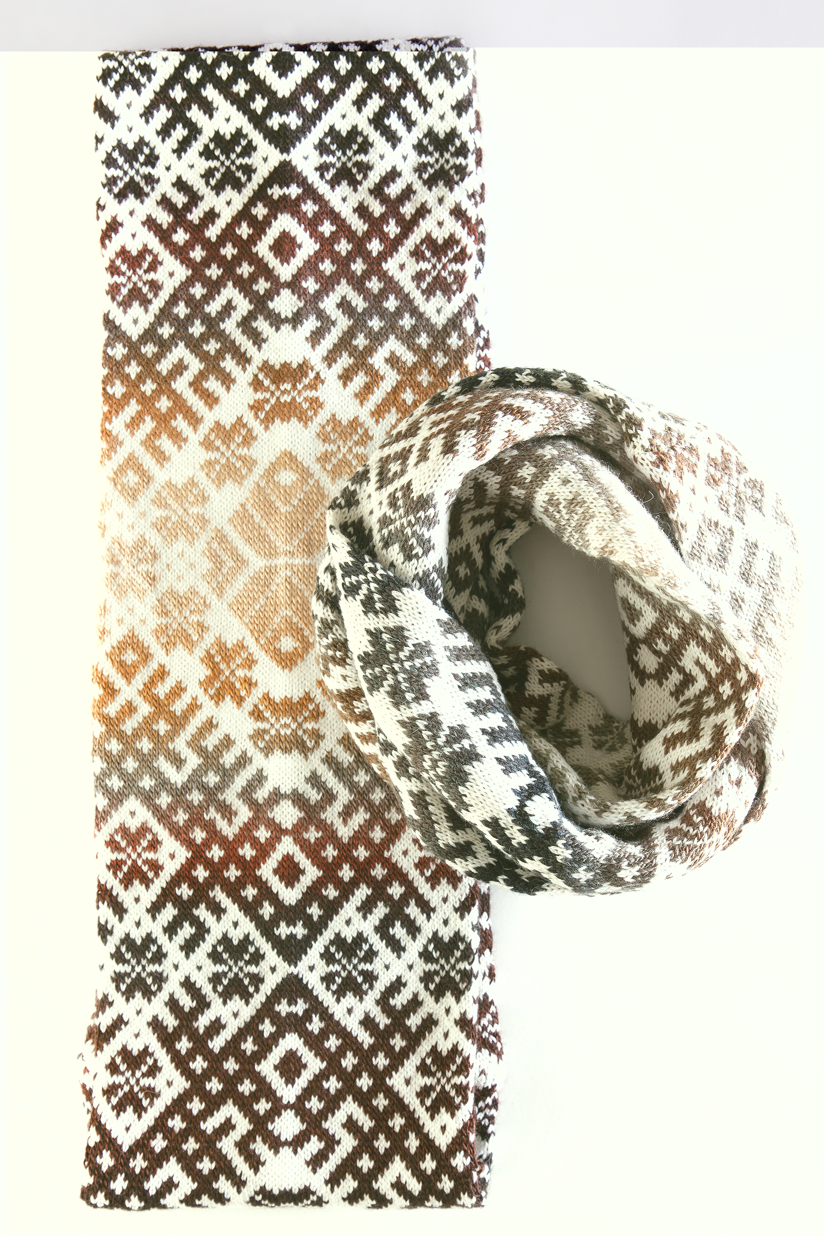 This scarf is infinity knitted from lightweight wool with Latvian symbols. White with deep red infinity scarf is ready to ship. Great looking, and double-breasted – never goes out. Soft and warm gift for him. This knitted scarf is with fair isle Latvian Symbols.